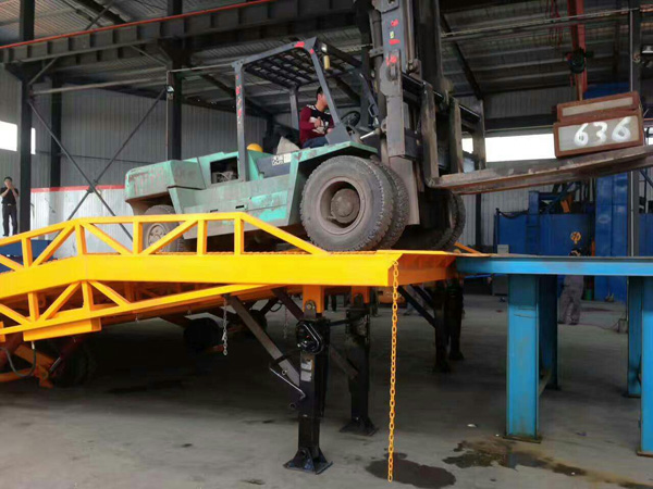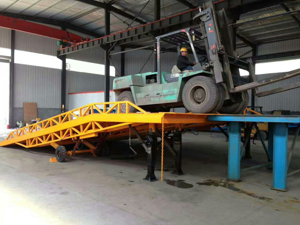 移動式液壓登車橋主要用于無裝卸設備的貨臺及流動裝卸場所,可與叉車配合使用,是貨物裝卸專用輔助設備。產品可達到的最低高度為1.1米,最高高度為1.8米,可以根據貨車高度進行調節,是裝卸貨物不可缺少的升降液壓設備之一。移動式液壓登車橋的主要作用是在地平面與車廂之間搭起一座橋,有了它,叉車能直接從地面攜帶貨物駛入汽車車廂內部,進行批量裝卸作業。使用時前板架在貨車車廂上,起到承載重量的作用,減少了貨物重量對液壓設備的壓力,保證了液壓登車橋的使用壽命,從而達到長期使用的目的。借助液壓登車橋,叉車能直接駛入汽車集裝箱內部進行批量裝卸作業。